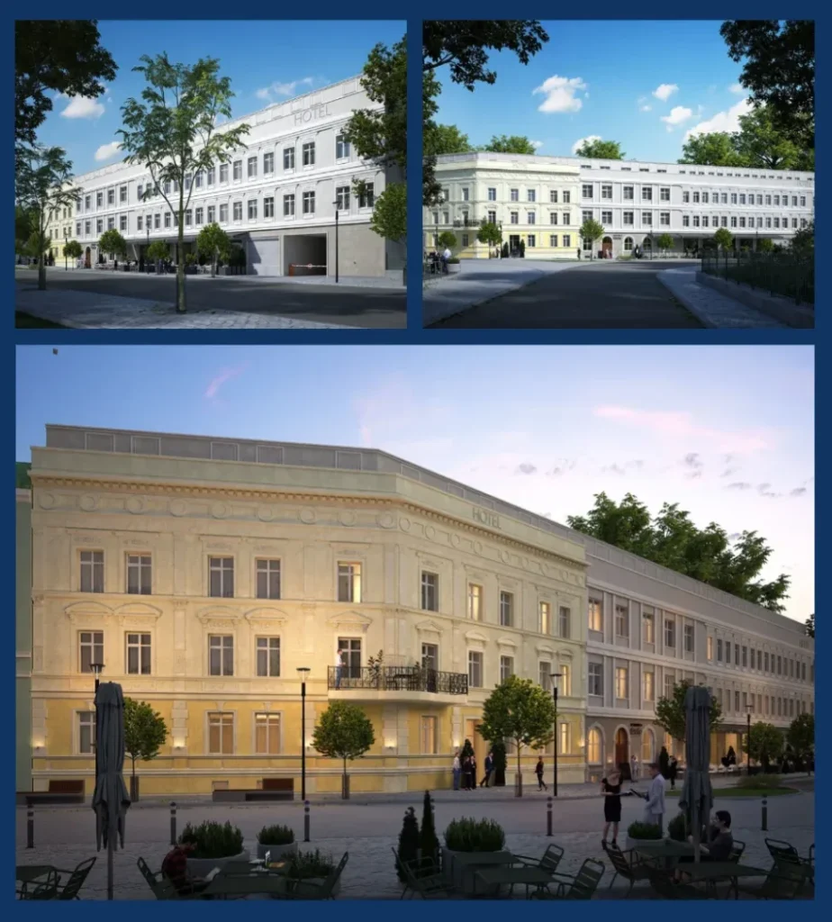 Kompleks dawnego Hotelu POLONIA będzie składał się z dwóch części połączonych ze sobą, części nowej oraz całkowicie zmodernizowanej, części zabytkowej. Pragniemy, aby Hotel POLONIA, był jednym z większych ośrodków wypoczynkowych w okolicy. Do dyspozycji Gości planujemy oddać blisko 90 pokoi, z czego połowa to będą pokoje dwuosobowe, natomiast druga połowa to pokoje rodzinne.